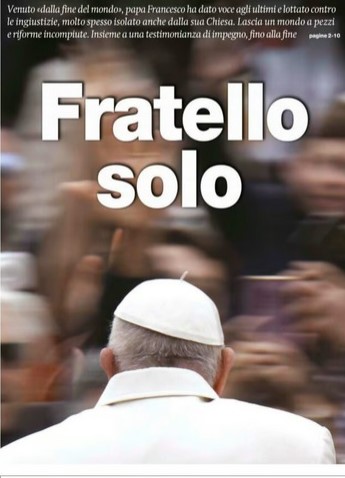 Per ricordare il suo pontificato, progressista e rivoluzionario sul piano sociale -economico-ambientale, conservatore sul piano dottrinale, profondamente cristiano nella testimoniamza del Vangelo, pubblichiamo due immagine apparentemente contrastanti e tre articoli che ben riassumo i motivi reali delle scelte che hanno determinato il suo stato di “Fratello solo” per i potenti della terra, i signori della guerra e delle armi, la garndefinanza speculativa e qualcu altro….ma amato e seguito, un segno visibile di speranza da miliardi di persone nel mondo, molte di loro in povertà e con vita “grama”. Pensandoci anche Gesù è rimasto solo, ma il suo messaggio vale sempre di più anche dopo 2.000 anni.