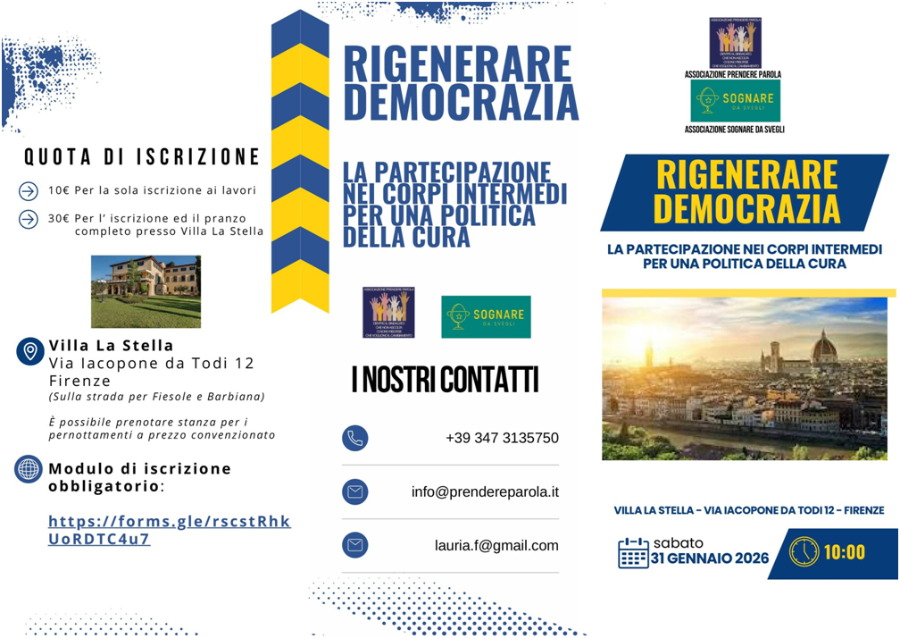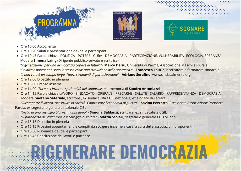 Un invito a tutti/e per partecipare, per informarsi, per collegarsi on line (comunicheremo la modalità) al seminario del 31 gennaio a Firenze (presso Fiesole) per “Rigenerare democrazia”. Un incontro fra storie e traiettorie politiche e personali diverse, per una ripartenza possibile per chiunque sia interessato a condividere questo percorso. Una riflessione sul senso del pluralismo dei e nei corpi intermedi come principio di vitalità democratica. Quella vitalità che manca all’azione sindacale perché è venuta scemando nella vita interna delle organizzazioni dove il senso critico anziché essere valorizzato e incentivato è temuto come una minaccia alla coesione dell’organizzazione..