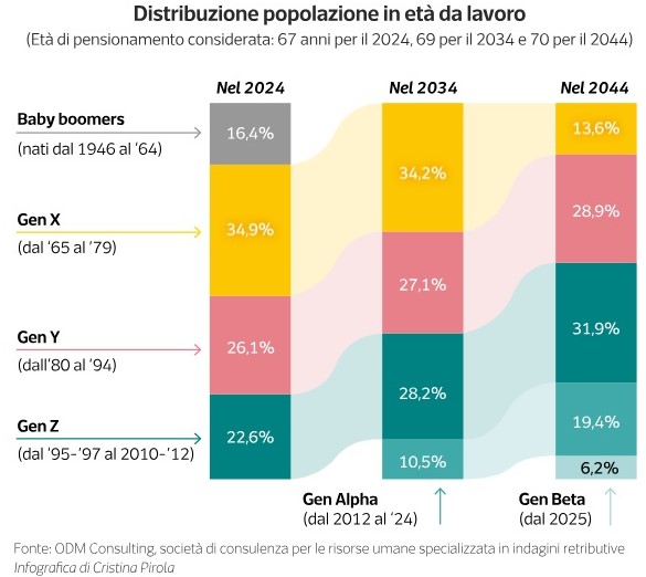 Ma cosa vogliono i Gen Z dal posto di lavoro? Decine di indagini raccontano tutte la stessa cosa, e cioè: voglio far parte del progetto e poter dire la mia; pretendo tecnologia adeguata, flessibilità, smart working e un buon equilibrio tra vita privata e lavoro; voglio sapere cosa mi aspetta, con chiarezza sul percorso di carriera e le opportunità di crescita. Se queste condizioni mancano, i Gen Z hanno una maggiore propensione rispetto alle generazioni precedenti a cambiare lavoro. È il motivo per cui le aziende sono davanti a una nuova sfida. I baby boomer (nati tra il 1946 e il 1964) ancora in età lavorativa oggi sono circa 6,6 milioni (60-67 anni), mentre i membri della Generazione Z maggiorenni, già entrati o pronti a entrare nel mercato del lavoro, sono 7,4 milioni (18-29 anni).