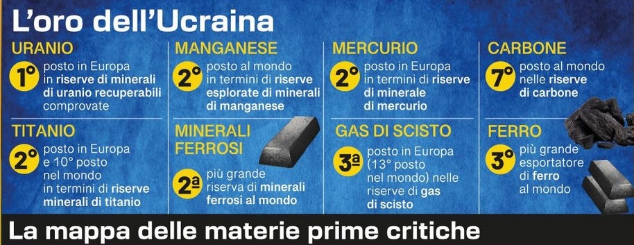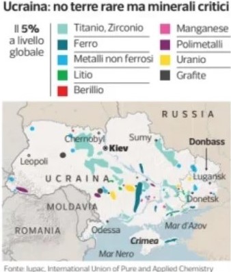 Il sottosuolo dell’Ucraina custodisce il 5% dei minerali critici come sono classificati ad esempio la grafite e litio che servono a fabbricare batterie, e il titanio utilizzato nell’industria aerospaziale. L’estrazione è molto inquinante perché si devono utilizzare acidi. Le terre rare non sono il tesoro dell’Ucraina, ma della Cina, che di fatto oggi ne gestisce il 90% del mercato mondiale. Le risorse su cui vuole mettere le mani Donald Trump sono proprio alcuni specifici minerali critici, molti dei quali si trovano a sud del Donbass.