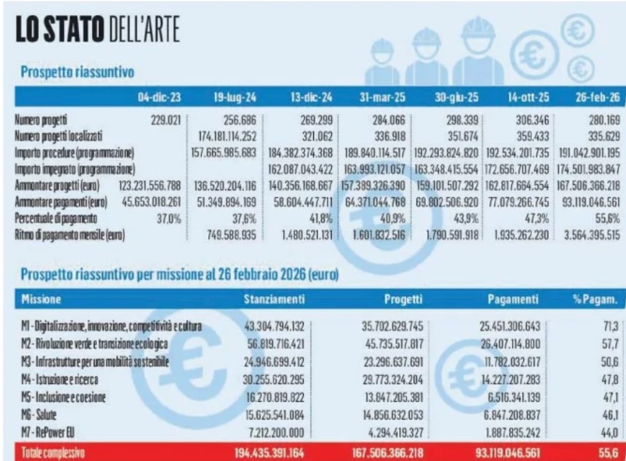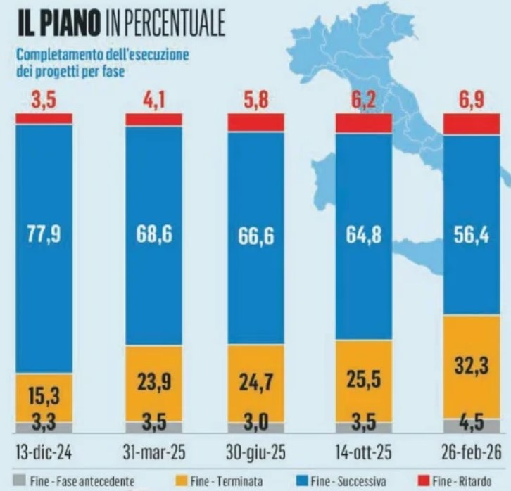Il 4,5% dei progetti (7,5 miliardi di euro) è ancora in una fase preliminare che precede l’esecuzione, il 32,3% è stato completato (54 miliardi), il 56,4% è in corso di esecuzione (94 miliardi), mentre il 6,9% (11,5 miliardi) doveva già essere terminato ma è in ritardo. Nella precedente ricognizione del 14 ottobre 2025 il ritardo nell’esecuzione dei progetti era al 6,2%.