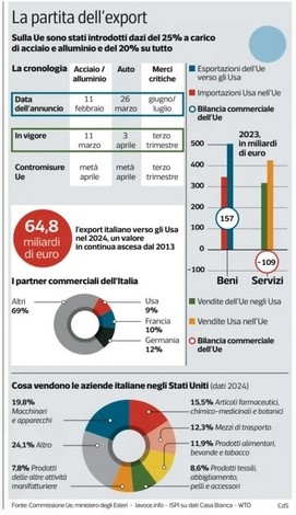 Valentina Iorio in Quell’inganno su cifre e tariffe, sul Corriere della Sera, così inizia << Sui dazi voluti da Donald Trump attenti all’inganno dei dati. Non c’è alcuna reciprocità nei dazi di Donald Trump e il presidente americano non ha ragione di sostenere che l’unione europea abbia «sfruttato» gli Stati Uniti attraverso pratiche commerciali per loro sfavorevoli o che il deficit commerciale degli Usa sia necessariamente frutto di presunte barriere. Con l’aiuto dell’economista Antonio Villafranca, vicepresidente per la ricerca dell’ispi, vediamo perché la narrazione del 47esimo inquilino della Casa Bianca non ha alcun fondamento economico e i dazi, in assenza di pratiche sleali, fanno male sia a chi li subisce che a chi li impone. Motivo per cui l’europa deve pesare bene le contromisure. (…).