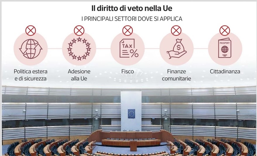 Così inizia « Se l’europa ha deciso così lentamente sull’ucraina e su Gaza, o non ha deciso affatto, è perché ognuno dei 27 può dire «dissento», mettendo il veto. È il meccanismo dell’unanimità. Nato con intenti nobili, per garantire ai singoli Paesi che «nulla sarà fatto contro di voi», è stato poi sostituito in tanti settori dal voto a maggioranza qualificata. Si applica però ancora in politica estera e di sicurezza, adesione alla Ue, fisco, finanze comunitarie, cittadinanza. E su temi minori. Ma per capire l’impatto e il potere del diritto di veto è utile focalizzarsi sugli anni della guerra in Ucraina.