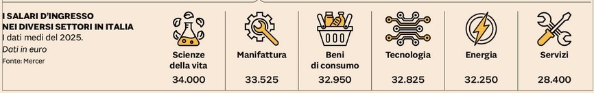 Il report di Mercer, contenuto nella Total remuneration survey, ha coinvolto 735 aziende che sono presenti in Italia, per un totale di circa 270.000 osservazioni retributive. Il campione è rappresentativo di imprese di medie e grandi dimensioni, con in media un fatturato di 830 milioni di euro e circa 1.430 dipendenti. Se prendiamo i settori, quello che paga meglio è il Life Science, con una retribuzione di ingresso media di 34mila euro, superiore del 6,25% alla media nazionale. Seguono la manifattura (33.525 euro), i beni di largo consumo (32.950 euro), l’high tech (32.825 euro) e l’energia (32.250 euro). I servizi non finanziari restano invece il settore meno competitivo, con una retribuzione di ingresso pari a 28.400 euro, circa l’11% in meno della media.
