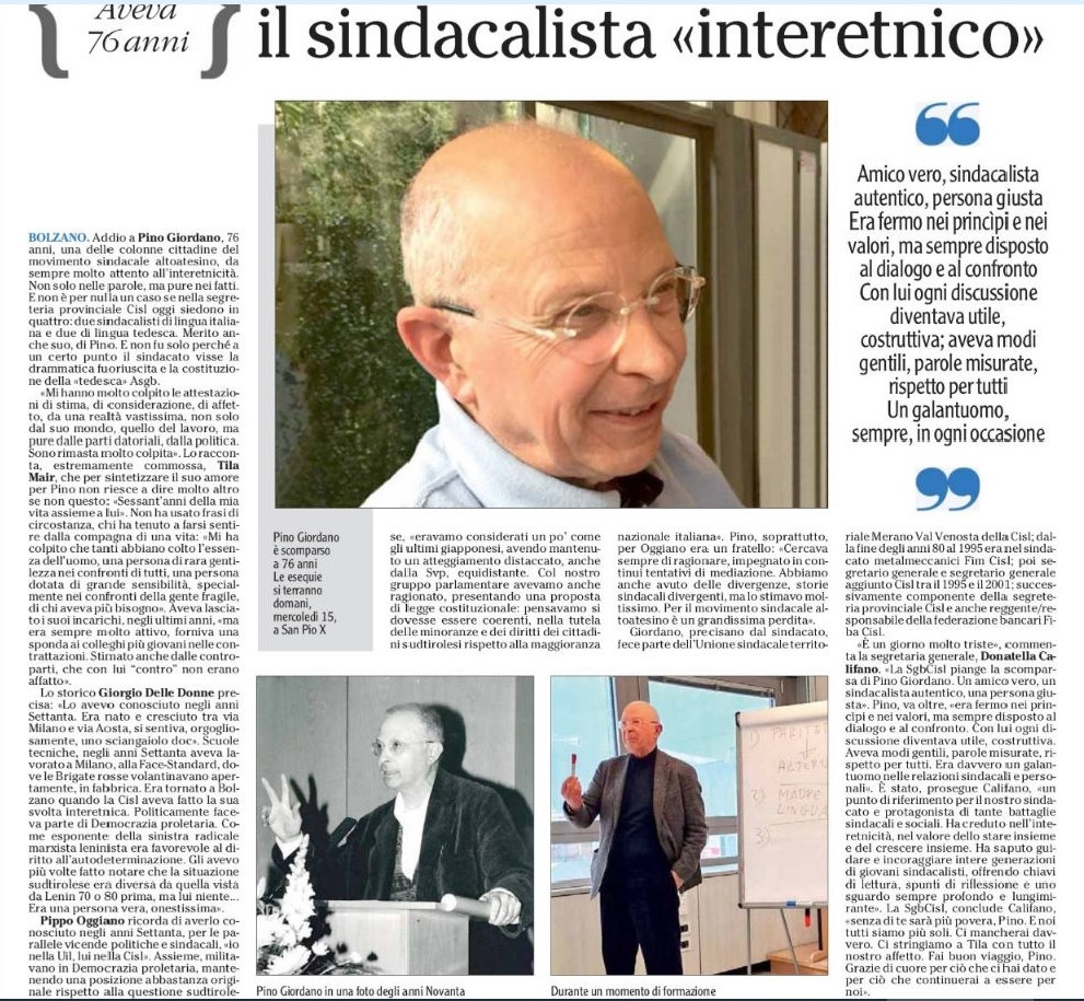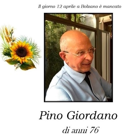 Non è possibile, per chi non ha vissuto l’esperienza della sua amicizia, quanto sia stato importante per noi Pino Giordano, morto ieri a Bolzano. Ora è troppo presto per testimoniarlo con mente lucida, come è giusto che sia, ricordando cosa ha fatto nella Sgb-Cisl a Bolzano e cosa ha fatto per noi; ci limitiamo a ringraziarlo per tutte le volte che ci ha accompagnato con consigli, correzioni e contributi per questo blog che firmava “Comma 22”. L’ultimo ce lo aveva preannunciato nelle settimane scorse, ma non c’è stato tempo e lo ha portato con sé.